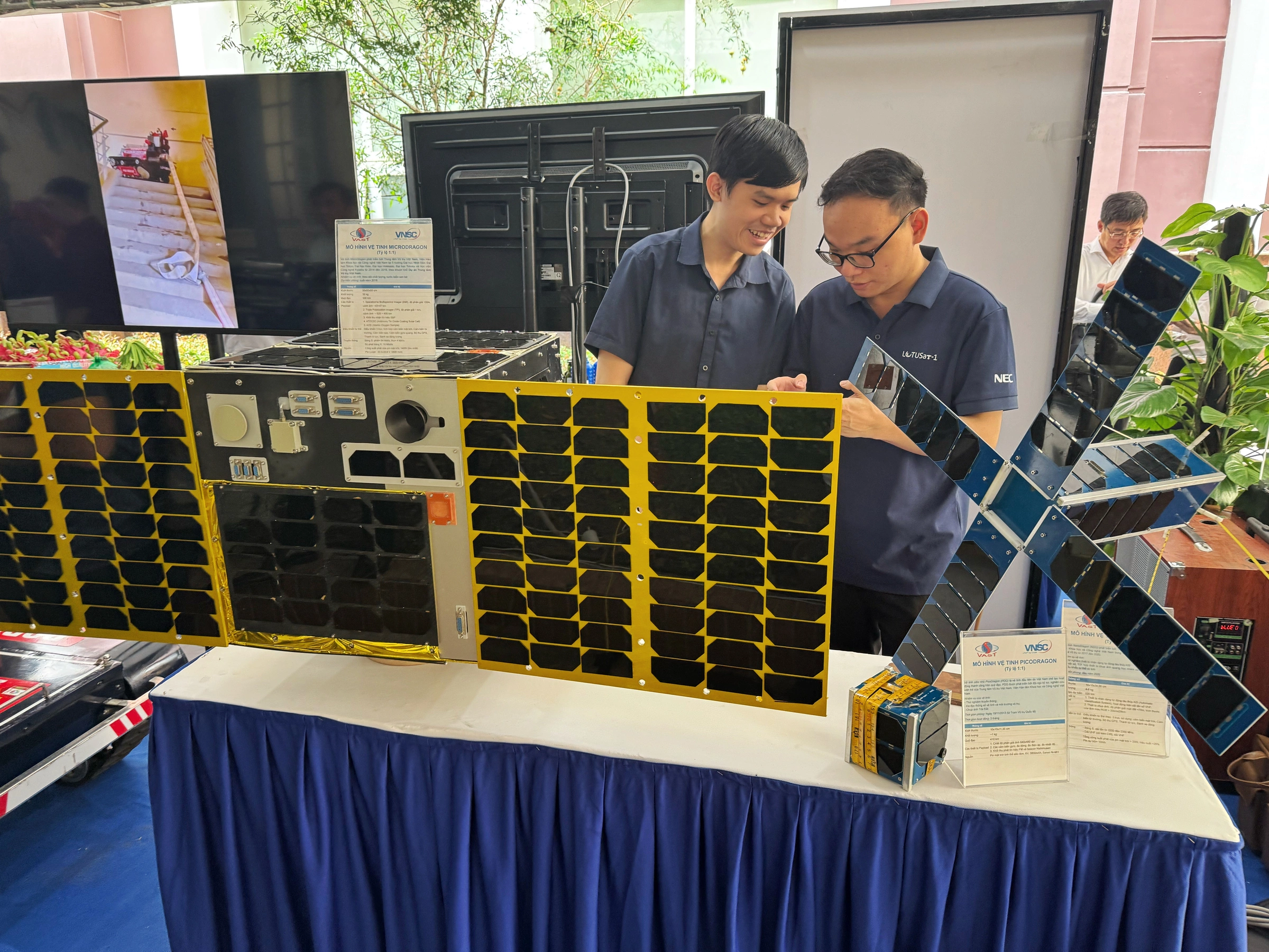 Loạt mô hình vệ tinh MicroDragon, NanoDragon, PicoDragon của Trung tâm Vũ trụ Việt Nam trưng bày tại Ngày hội Khoa học và Công nghệ 2025, tại trụ sở Bộ Khoa học và Công nghệ, ngày 16/5. Ảnh: Lưu Quý