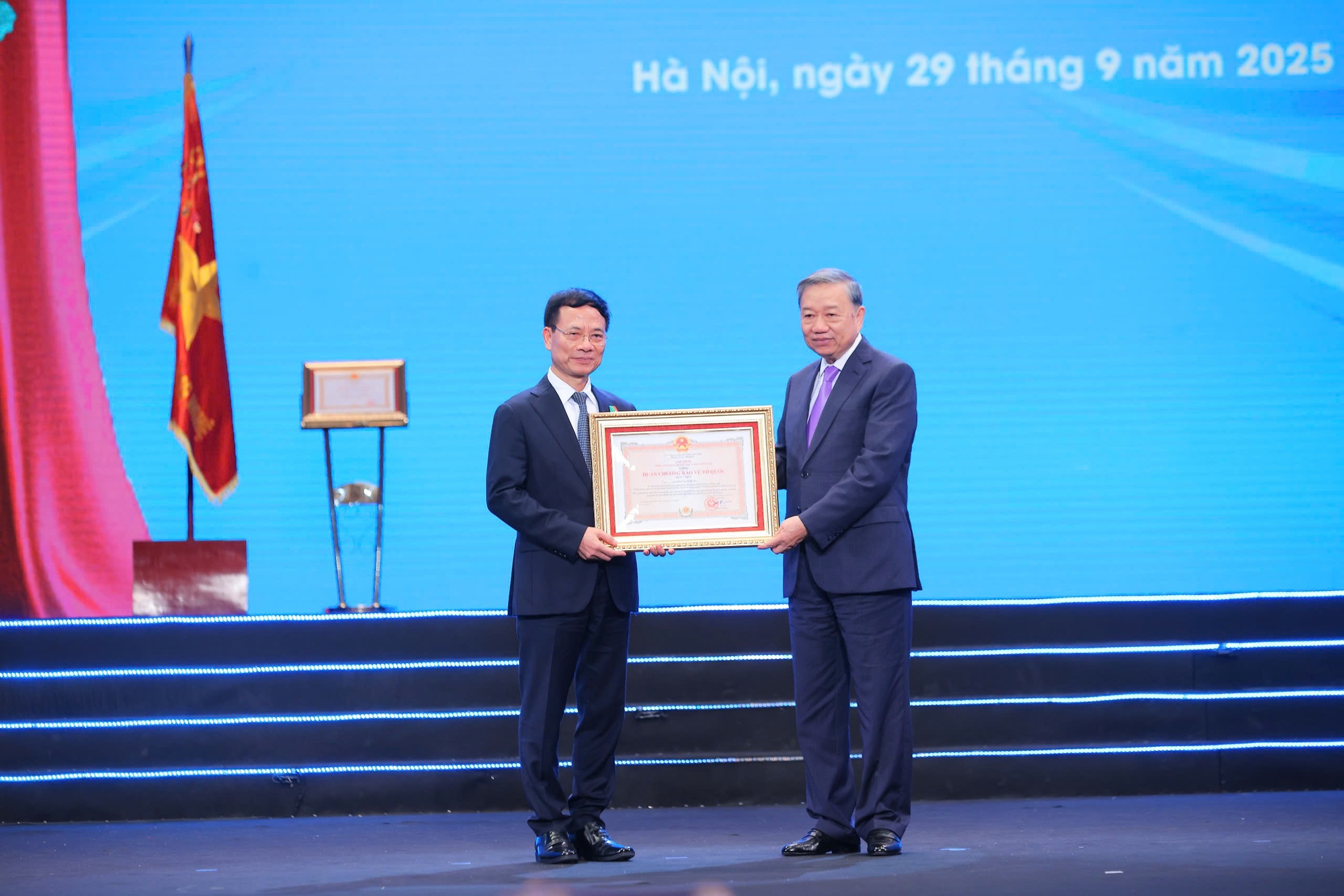 Với thành tích đặc biệt xuất sắc đột xuất trong công tác tham mưu phát triển khoa học, công nghệ, đổi mới sáng tạo và chuyển đổi số, góp phần vào sự nghiệp xây dựng và bảo vệ Tổ quốc giai đoạn 2023-2025, Bộ KH&CN được tặng thưởng Huân chương Lao động hạng Nhất, theo quyết định của Chủ tịch nước. Đồng chí Nguyễn Mạnh Hùng, Bộ trưởng KH&CN, Thiếu tướng, nguyên Chủ tịch - Tổng giám đốc Tập đoàn Viễn thông quân đội, được tặng thưởng Huân chương Bảo vệ Tổ quốc hạng Nhất. Trong Quyết định của Chủ tịch nước, đồng chí Nguyễn Mạnh Hùng được ghi nhận "đã có thành tích xuất sắc trong nghiên cứu, ứng dụng khoa học và công nghệ kết hợp với quốc phòng an ninh, góp phần vào sự nghiệp xây dựng quân đội, củng cố quốc phòng và bảo vệ Tổ quốc".Tổng Bí thư Tô Lâm trao Huân chương Bảo vệ Tổ quốc hạng Nhất tặng đồng chí Nguyễn Mạnh Hùng, Ủy viên Trung ương Đảng, Bộ trưởng Bộ KH&CN.