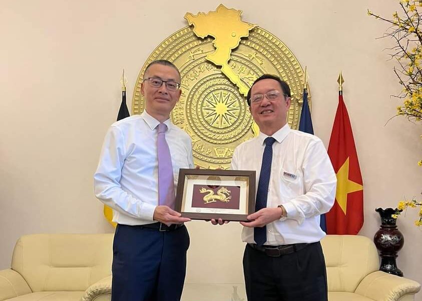 Bộ trưởng Huỳnh Thành Đạt và Đại sứ Việt Nam tại CHLB Đức Vũ Quang Minh tại buổi gặp mặt.