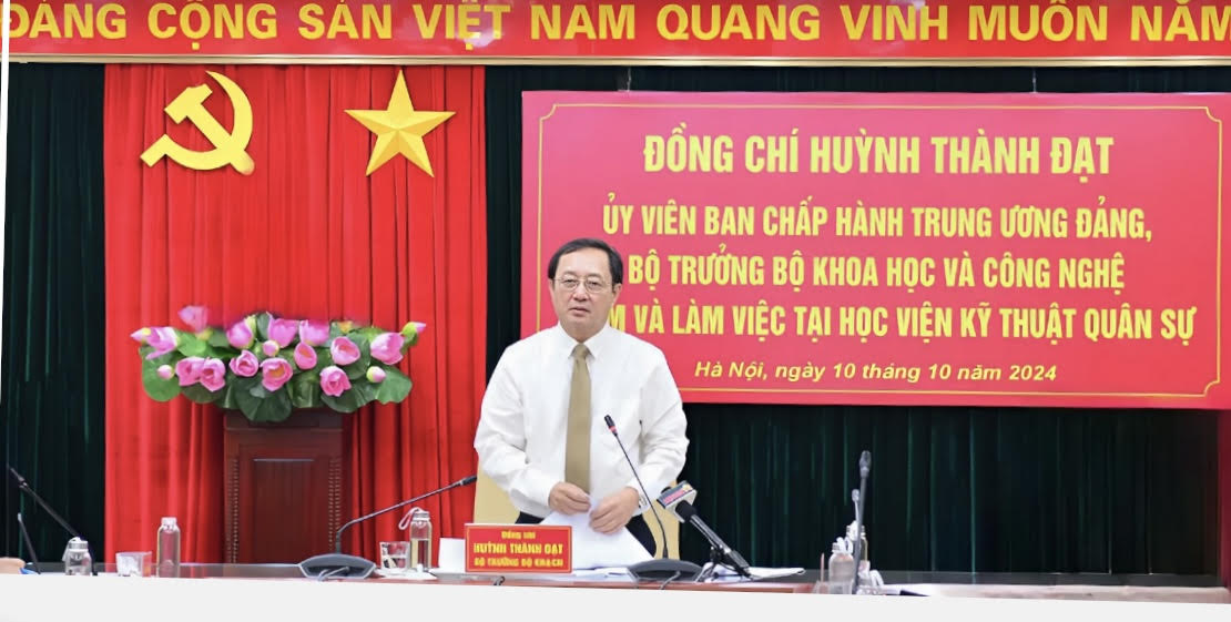 Tại buổi làm việc với Học viện Kỹ thuật Quân sự (Bộ Quốc phòng), ngày 10/10/2024, Bộ trưởng Bộ Khoa học và Công nghệ (KH&CN) Huỳnh Thành Đạt khẳng định, Bộ KH&CN luôn phối hợp chặt chẽ với Bộ Quốc phòng bám sát các định hướng của Quân ủy Trung ương để xây dựng và triển khai những nhóm sản phẩm chủ lực phục vụ huấn luyện và sẵn sàng chiến đấu, tiến tới trang bị cho quân đội góp phần vào sự nghiệp bảo vệ tổ quốc trong tình hình mới.