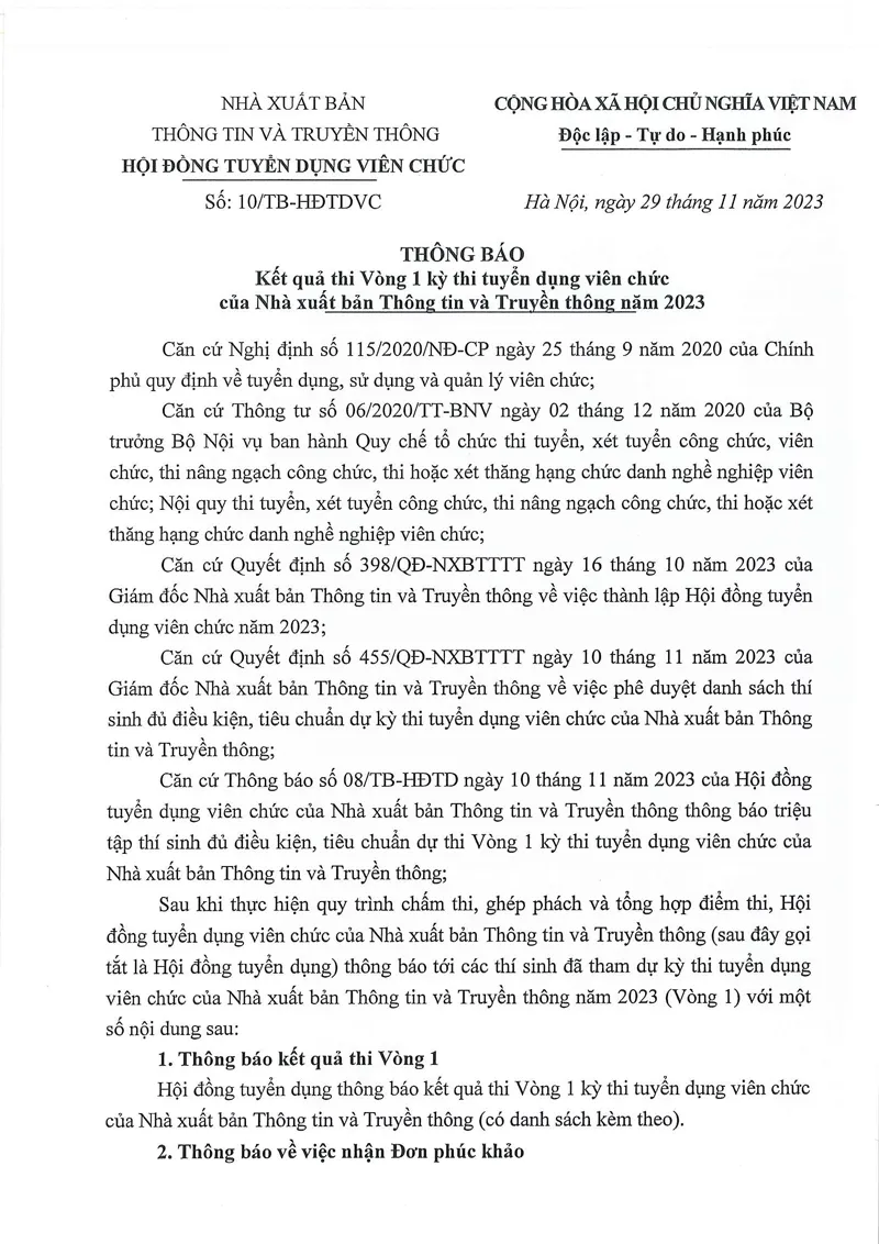 Hôm nay ngày 29/11/2023, Nhà xuất bản Thông tin và Truyền thông công bố kết quả thi vòng 1 - Kỳ thi tuyển dụng viên chức năm 2023
