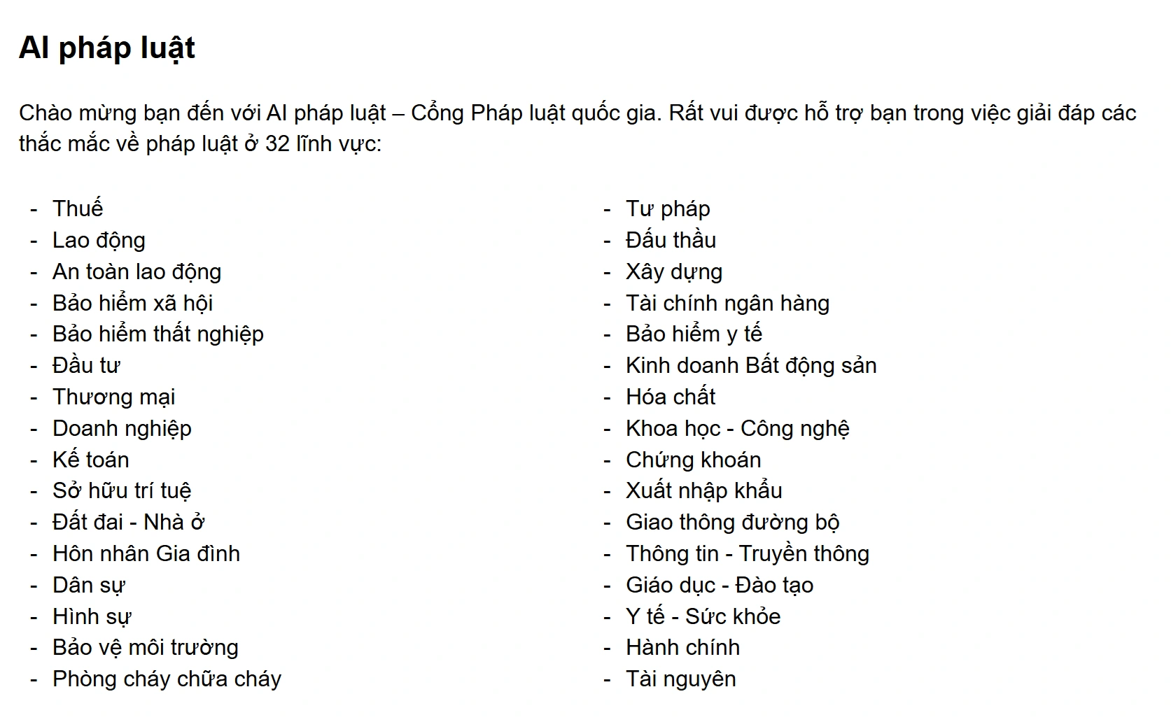 Nhằm tăng cường ứng dụng công nghệ, chuyển đổi số trong công tác xây dựng, thực thi, phổ biến, giáo dục pháp luật, Bộ Tư pháp đã xây dựng Cổng Pháp luật Quốc gia và chính thức được khai trương vào ngày 31/5 vừa qua. Người dùng có thể truy cập Cổng Pháp luật Quốc gia tại đây.Đây là kênh chính thống được ra đời với mục đích phục vụ kịp thời, đầy đủ chính xác việc tra cứu thông tin pháp luật của người dân, doanh nghiệp. Ngoài ra, trên Cổng Pháp luật Quốc gia cũng được tích hợp một chatbot trí tuệ nhân tạo, mang tên gọi AI Pháp luật, cho phép người dùng tra cứu các điều luật một cách nhanh chóng, dễ dàng thông qua việc đặt câu hỏi, như khi đang nói chuyện với một người tư vấn luật thực sự. Khác với các công cụ tìm kiếm hoặc chatbot AI được phát triển bởi các công ty nước ngoài, AI Pháp luật được quản lý và phát triển dưới sự giám sát của Cục Phổ biến, giáo dục pháp luật và Trợ giúp pháp lý (thuộc Bộ Tư pháp), với cơ sở dữ liệu huấn luyện từ chính các điều luật tại Việt Nam, do vậy người dùng có thể an tâm về các nội dung do AI Pháp luật cung cấp. Hiện tại, AI Pháp luật có thể giúp người dùng giải đáp các vấn đề pháp lý ở 32 lĩnh vực. Với mục tiêu trở thành một Trợ lý pháp luật, công cụ này đang được tiếp tục huấn luyện để mở rộng kiến thức ở nhiều lĩnh vực pháp lý khác nhau.