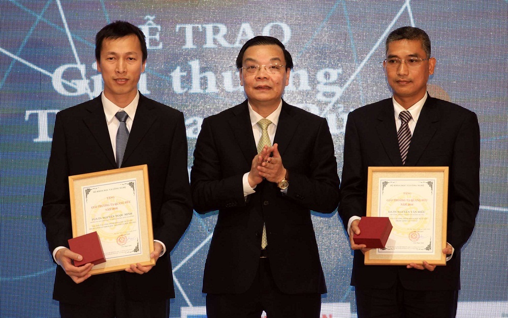 Bộ trưởng Bộ khoa học và công nghệ Chu Ngọc Anh (bên trái) trao Giải thưởng Nhà khoa học có công trình xuất sắc cho GS.TS Nguyễn Văn Hiếu, Viện ITMS, Trường Đại học Bách Khoa Hà Nội và PGS.TS Nguyễn Ngọc Minh, Trường Đại học khoa học tự nhiên, Đại học Quốc gia Hà Nội