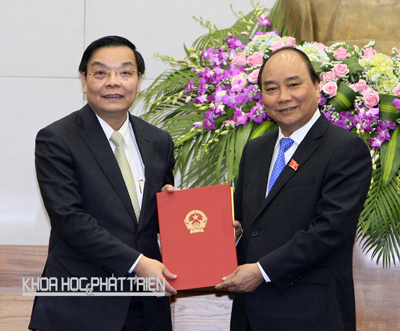 Thủ tướng Nguyễn Xuân Phúc trao quyết định của Chủ tịch Nước bổ nhiệm thành viên Chính phủ cho đồng chí Chu Ngọc Anh - Uỷ viên Trung ương Đảng, Bộ trưởng Bộ Khoa học và Công nghệ. Ảnh: TTXVN