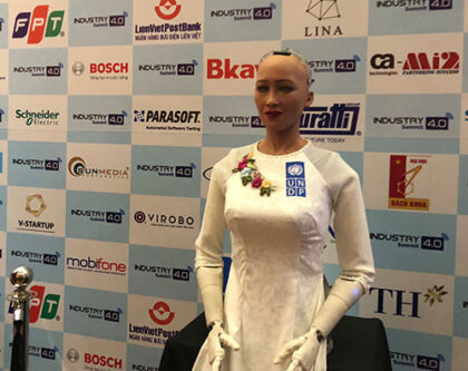 Trong tà áo dài trắng, Sophia đã giới thiệu về mình và trả lời câu hỏi về chiến lược của Việt Nam cần có trong thời đại cách mạng công nghiệp 4.0. “Tôi là người đại diện cho kỷ nguyên 4.0. Tôi cho rằng Việt Nam cần đẩy mạnh sự sáng tạo về công nghệ để phát triển bền vững hơn”, Sophia nói.