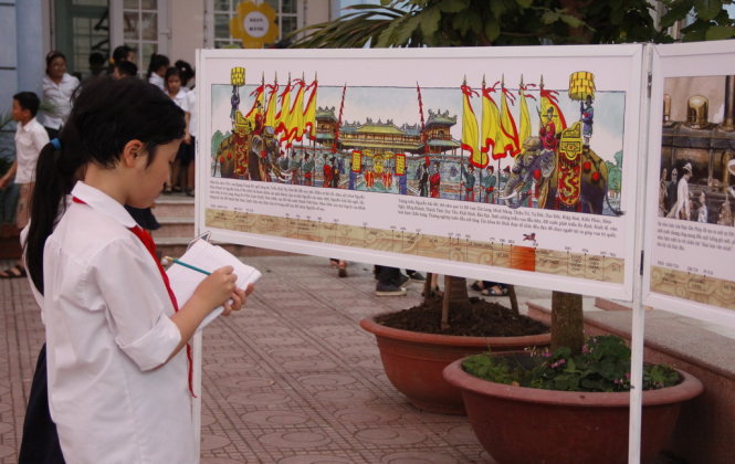 Học sinh trường tiểu học Bạch Mai tranh thủ ghi chép tư liệu từ bộ sách Lịch sử Việt Nam bằng tranh - Ảnh: Đức Triết