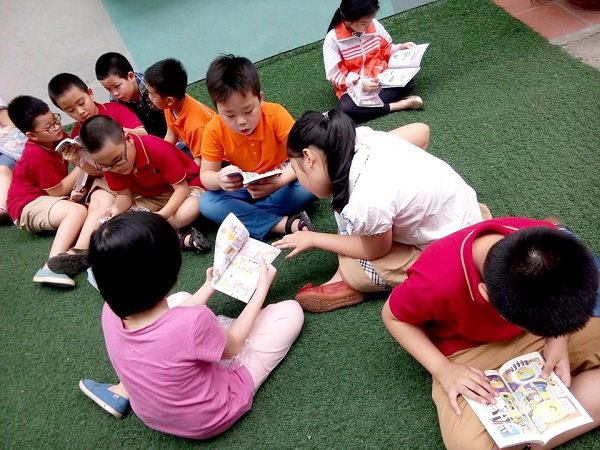 Các em học sinh trường tiểu học Lomonoxop Mỹ Đình ngồi bệt trên cỏ đọc sách - Ảnh: Trường Lomonoxop