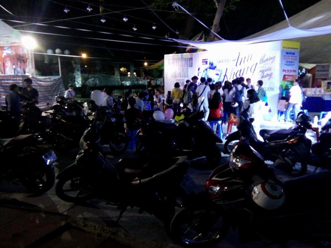 Đông đảo bạn đọc lấy xe máy rồi quay lại hội sách đợi đến 1g sáng (ngày 22-3) chờ tác giả Anh Khang ký tặng - Ảnh: Facebook nhân vật