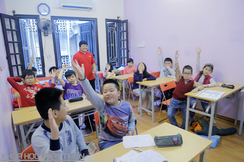 Các em học sinh hăng hái trong giờ học toán của thầy giáo nước ngoài. Ảnh: Loan Lê