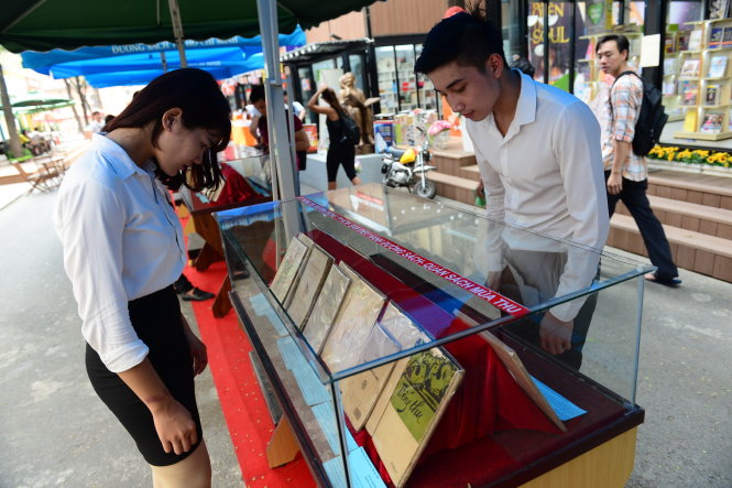 Khách tham quan triển lãm các ấn phẩm quý hiếm thuộc dòng văn học lãng mạn Việt Nam đầu thế kỷ 20 tại Đường sách Nguyễn Văn Bình, Q.1, TP.HCM chiều 20-4 - Ảnh: Quang Định