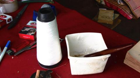 Cuộn chỉ để khâu và loại bột dán này được ông làm tại nhà.