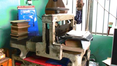 Trong góc phòng khách căn nhà, ông đặt chiếc máy nén bìa, cắt bìa thô sơ, hoàn toàn khởi động bằng tay. Sau khi dán bìa, cuốn sách sẽ được đưa vào máy, dùng lực lò xo quay tay để ép cho bìa và các trang sách dính lại với nhau một cách chắc chắn ở phần gáy sách. Chiếc máy này đã theo ông suốt 37 năm qua. Nó như người bạn đồng hành, cùng ông chứng kiến biết bao thăng trầm của nghề đóng sách cũ này.