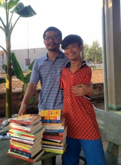 Tặng sách cho một cậu bé khuyết tật ở nông thôn