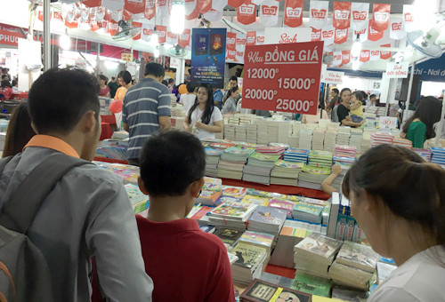Độc giả chen chân tìm mua sách giảm giá ở Hội sách TP HCM lần thứ chín.