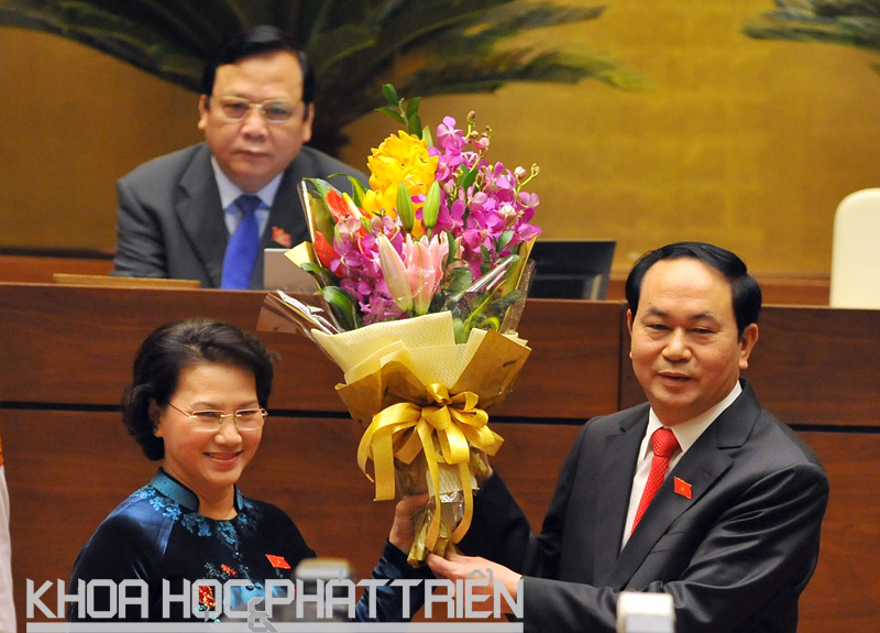 Chủ tịch Quốc hội Nguyễn Thị Kim Ngân chúc mừng Tân Chủ tịch nước Trần Đại Quang. Ảnh: NY.