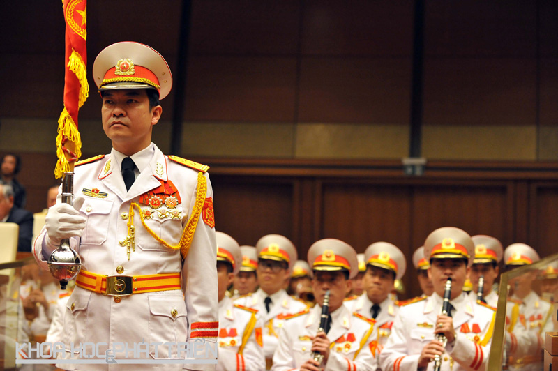 Đội nghi lễ rước cờ Tổ quốc và Hiến pháp lên bục tuyên thệ. Ảnh: NY.