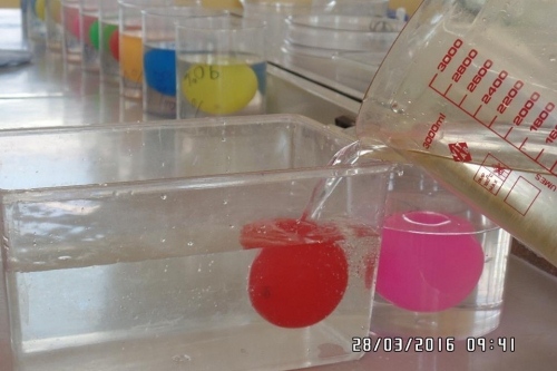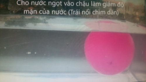 Tiếp tục làm tăng độ mặn của nước trong chậu bằng cách lấy nước mặn đổ vào chậu đang chứa nước ngọt, thấy quả bóng từ từ nổi lên mặt nước. Vì nước mặn có tỷ trọng nặng hơn nước ngọt nên độ mặn càng tăng thì trái bóng càng nổi lên cao theo tỷ lệ thuận.