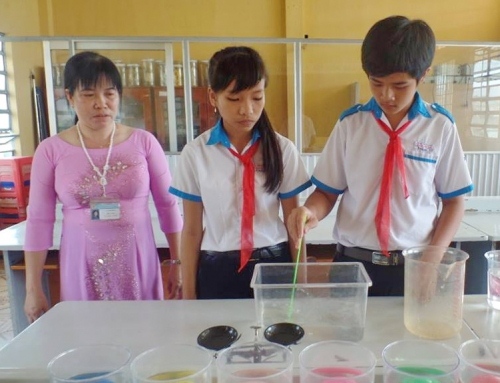 Cô Lư Thị Huệ đang hướng dẫn các em học sinh làm thí nghiệm