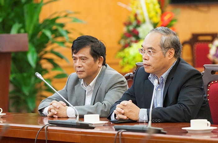 Ông Đỗ Xuân Cương (trái) và Ông Tạ Doãn Trịnh (phải) trong buổi Bộ trưởng gặp và trao quyết định về hưu theo chế độ