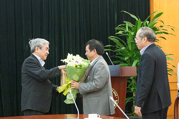Thay mặt đơn vị tổ chức buổi gặp mặt, TS. Trần Đắc Hiến, Vụ trưởng Tổ chức cán bộ đã đọc toàn văn quyết định về hưu theo chế độ của hai ông Tạ Doãn Trịnh và Đỗ Xuân Cương, và điểm lại những đóng góp của hai ông trong quá trình công tác tại Bộ KH&CN. Tiếp đó, Bộ trưởng KH&CN đã trịnh trọng trao quyết định về hưu theo chế độ và quà lưu niệm cho hai ông.