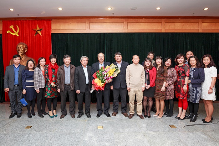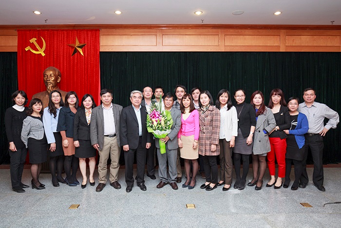 Ông Đỗ Xuân Cương chụp ảnh lưu niệm với Bộ trưởng và cán bộ nhân viên đơn vị cũ