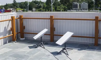 Hai ăng-ten thu phát sóng Internet vệ tinh Starlink thử nghiệm tại Hòa Lạc (Hà Nội), tháng 10/2023. Ảnh: Lưu Quý