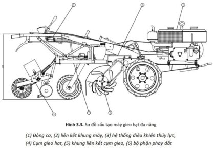 Máy gieo hạt đa năng có 6 bộ phận chính gồm động cơ diesel công suất 16 HP, liên kết khung máy, hệ thống điều khiển thủy lực, cụm gieo hạt, khung liên kết cụm gieo, bộ phận phay đất.