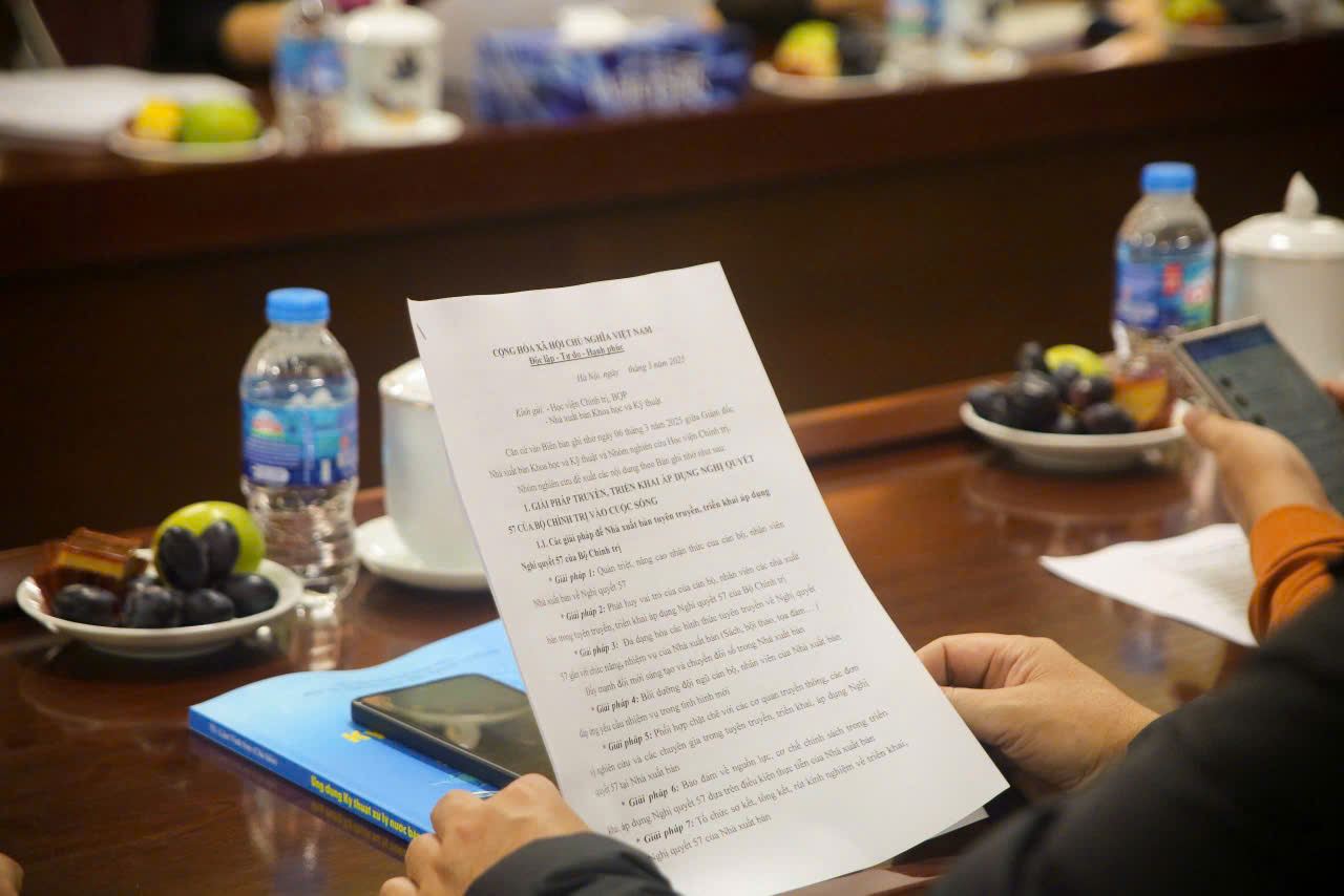 Các đại biểu đã thảo luận về việc ứng dụng các nền tảng số, mạng xã hội và phương thức truyền thông đa kênh nhằm tối ưu hóa hiệu quả tuyên truyền. Việc kết hợp xuất bản phẩm truyền thống với các nội dung số hóa, tổ chức hội thảo chuyên đề, tọa đàm khoa học và chương trình xuất bản truyền thông tương tác là những giải pháp trọng tâm giúp đưa Nghị quyết 57 đến gần hơn với công chúng. II. Phát triển nội dung phù hợp với đội ngũ Nhà khoa học và chuyên gia truyền thông Một trong những nội dung quan trọng của hội nghị là thúc đẩy hợp tác và trao đổi chuyên môn giữa Nhà xuất bản với đội ngũ Nhà khoa học và chuyên gia truyền thông nhằm đảm bảo chất lượng nội dung, ứng dụng công nghệ trong xuất bản và nâng cao hiệu quả truyền thông nghị quyết. Trong bối cảnh thông tin đa chiều, những người làm công tác nghiên cứu và truyền thông cần có cách tiếp cận chuyên sâu, ứng dụng công nghệ số và phương pháp truyền thông hiện đại để tối ưu hóa việc lan tỏa thông tin. Nhà xuất bản sẽ mời các chuyên gia làm cố vấn hoặc giảng viên cho các chương trình bồi dưỡng kỹ năng xuất bản, truyền thông chính sách, giúp nâng cao chất lượng nội dung và định hướng phát triển phù hợp với yêu cầu thực tiễn. Đồng thời, việc xây dựng mạng lưới chuyên gia truyền thông sẽ tạo điều kiện cho họ cùng tham gia vào các dự án nghiên cứu, xuất bản và truyền thông nghị quyết, từ đó tăng cường sự kết nối giữa lý luận và thực tiễn, đảm bảo nội dung truyền thông có giá trị ứng dụng cao và phù hợp với xu hướng phát triển của ngành.