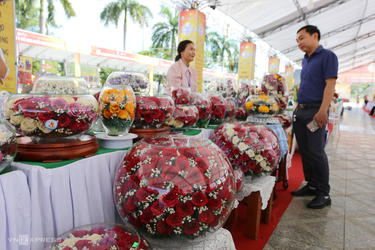 Chị Trần Thị Hằng, xã Quế Mỹ, huyện Quế Sơn, Quảng Nam giới thiệu sản phẩm ướp hoa thành nghệ thuật có thể giữ được độ tươi gần 10 năm. Chị ứng dụng công nghệ cát bột hút ẩm để làm hoa khô và giữ được màu sắc trong thời gian dài.