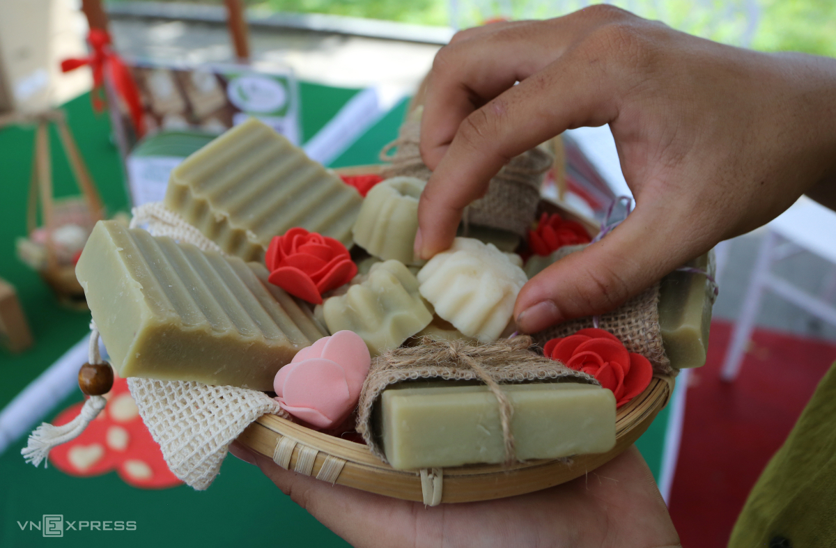 Tương tự, nhóm học sinh đến từ Trường Trung cấp nghề Dân tộc nội trú Kiên Giang trưng bày sản phẩm xà phòng Hanhmade Mocha làm từ bơ, dầu dừa, đậu nành, khổ qua rừng, tinh dầu bạc hà... Sản phẩm có tác dụng trị mụn, rôm sẩy, giảm viên da, mát da, dưỡng và sáng da.