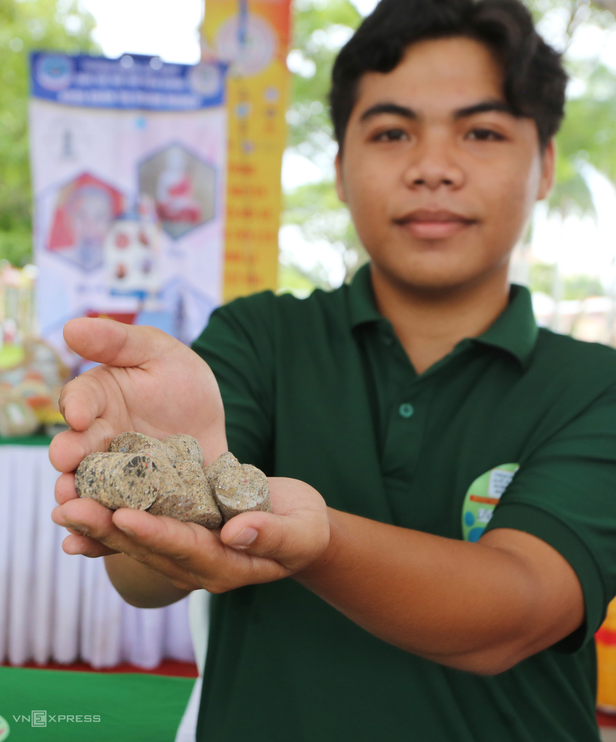 Em Trương Thành Phúc, học sinh lớp 11, trường THPT chuyên Huỳnh Mẫm Đạt, Kiên Giang giới thiệu sản phẩm "Viên nén tái tạo hiệp đồng từ đất biển Kiên Giang". Sản phẩm được làm từ rác thải nhựa, vỏ trấu và bột đá dolomit thành viên nén tạo chất đốt thân thiện môi trường, thay thế phù hợp cho nhiên liệu hóa thạch đang dần cạn kiệt.