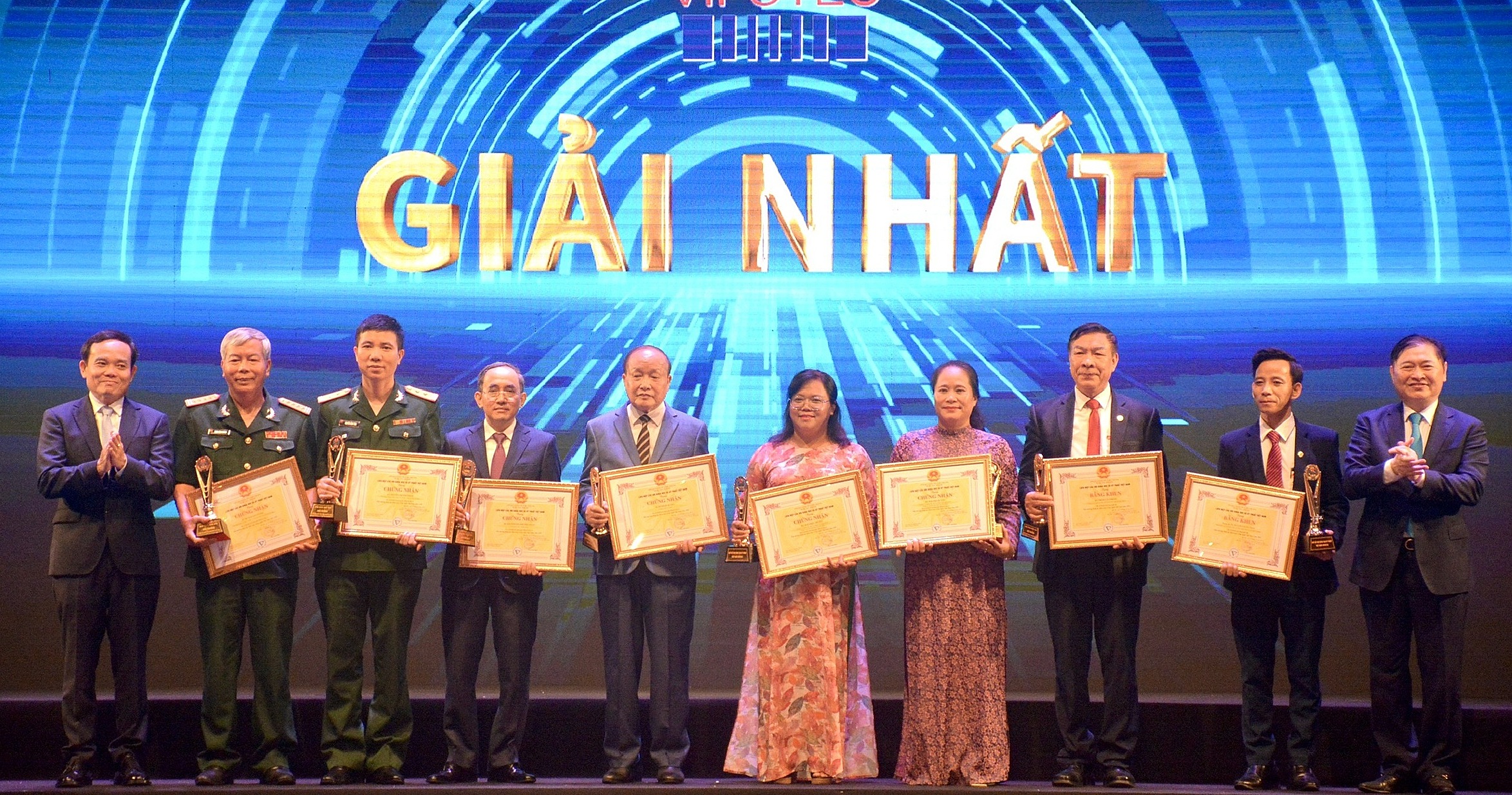 Phó thủ tướng Trần Lưu Quang (bìa trái) và TSKH Phan Xuân Dũng (bìa phải) trao bằng khen cho các tác giả công trình đoạt giải nhất. Ảnh: La Duy