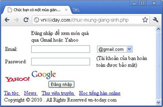 Những email lừa đảo này có thông điệp: “Chúc mừng Giáng sinh, giáng sinh vui vẻ nhé, gửi tới món quà giáng sinh nho nhỏ” và kèm theo đường link http://vn[removed]day.com/chuc-mung-giang-sinh.php. Đường link này dẫn tới một website có nội dung yêu cầu người sử dụng đăng nhập bằng tài khoản Yahoo! Mail hoặc Gmail để xem món quà. Nếu thực hiện theo yêu cầu đó, người sử dụng sẽ nhận được một thiệp điện tử, tuy nhiên, họ không hề biết rằng những thông tin về tài khoản và mật khẩu của mình đã bị hacker nắm giữ.