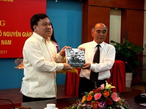 Thứ trưởng Đỗ Qúy Doãn trao tặng cuốn sách ảnh "Đại tướng Tổng Tư Lệnh Võ Nguyên Giáp" cho Phó Chủ tịch Hội CCBVN Đỗ Công Mùi.(Nguồn: wcag.mic.gov.vn)