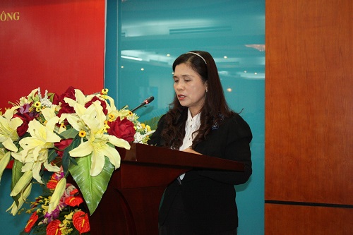 Bà Nguyễn Thị Thu Hà, Giám đốc – Tổng biên tập NXB TT&TT báo cáo tại hội nghị
