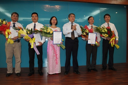 Thay mặt Lãnh đạo Bộ TT&TT, Thứ trưởng Lê Nam Thắng (đứng giữa) trao quyết định cho các đồng chí được bổ nhiệm