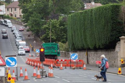 Việc tỉa cây chiếm nguyên một làn đường, tại đoạn bên ngoài căn nhà