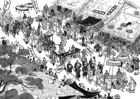 Một trang trong truyện "Long Thần Tướng" mô tả cảnh sinh hoạt của người Việt thời Trần qua nét vẽ của họa sĩ Nguyễn Thành Phong