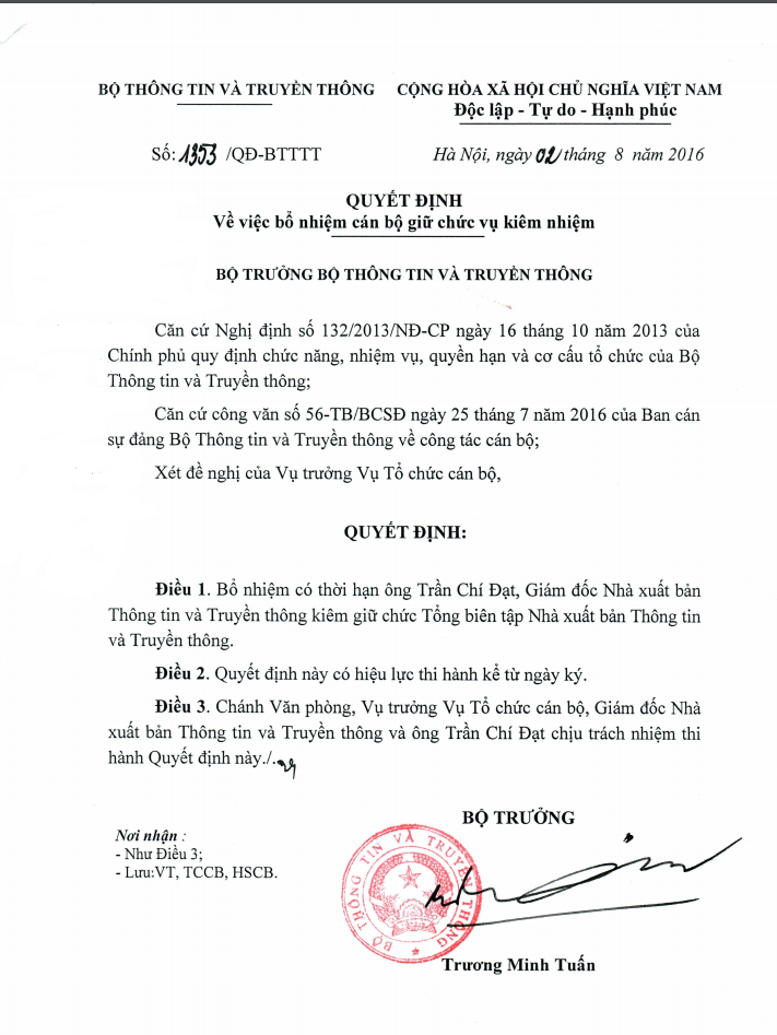 Cụ thể, theo Quyết định số 1353/QĐ-BTTTT được Bộ trưởng Trương Minh Tuấn ký ngày 02/8/2016, ông Trần Chí Đạt – Giám đốc NXB Thông tin và Truyền thông được bổ nhiệm có thời hạn kiêm giữ chức Tổng Biên tập NXB Thông tin và Truyền thông.