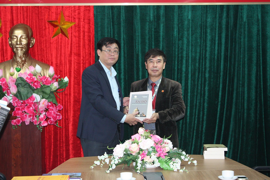 Lãnh đạo Nhà xuất bản và Trung tâm Nghiên cứu Ấn Độ đang giới thiệu một số đầu sách tiêu biểu của mỗi đơn vị...