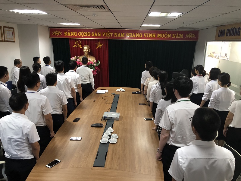 Lãnh đạo NXB TT&TT cùng toàn thể cán bộ viên chức NXB thực hiện nghi thức Chào cờ và hát Quốc ca