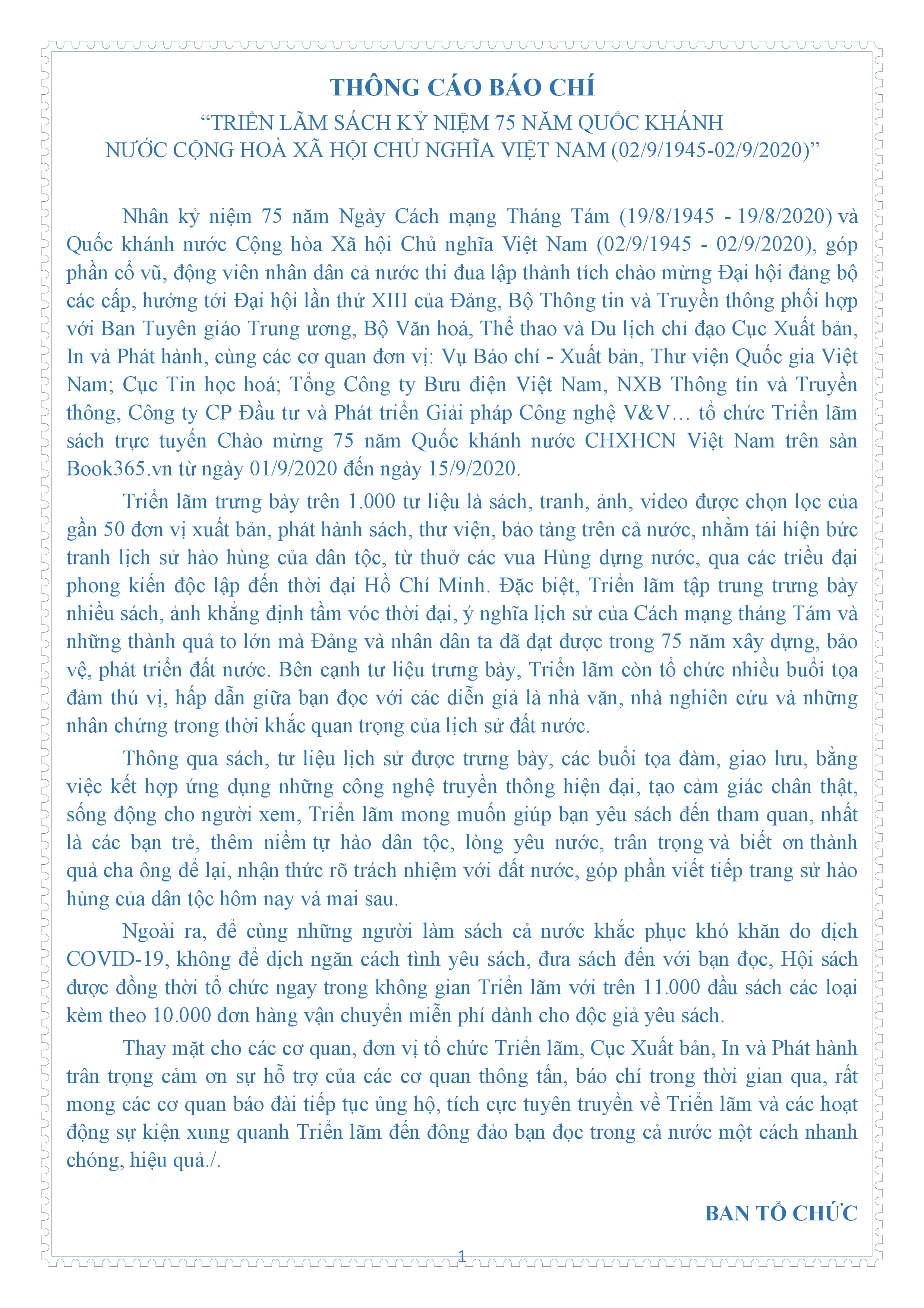Thông cáo báo chí Triển lãm sách kỷ niệm 75 năm Quốc khánh nước CHXHCN Việt NamThứ bảy, 29/08/2020, 00:12