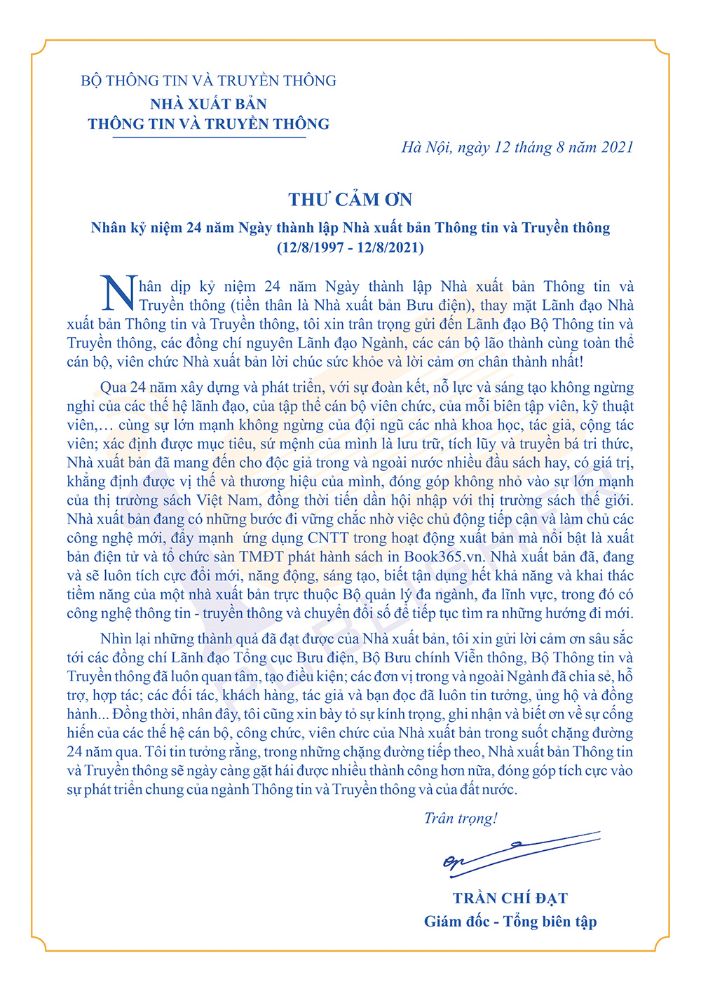 Thư cảm ơn của Giám đốc - Tổng Biên tập Nhà xuất bản Thông tin và Truyền thông nhân Kỷ niệm 24 năm Ngày thành lập Nhà xuất bản.Thứ tư, 11/08/2021, 18:45