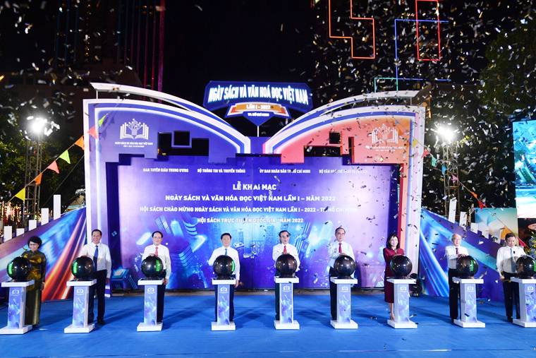 (Mic.gov.vn) - Tối 19/4, đông đảo người yêu sách đến phố đi bộ Nguyễn Huệ, TP.HCM, dự lễ khai mạc Ngày Sách và Văn hóa đọc lần thứ nhất. Đây là sự kiện mở đầu nhiều hoạt động lan tỏa văn hóa đọc trên cả nước. Tới dự Lễ khai mạc có các đồng chí: Nguyễn Văn Nên, Ủy viên Bộ Chính trị, Bí thư Thành ủy TP.HCM; Phan Văn Mãi, Ủy viên Trung ương Đảng, Chủ tịch UBND TP.HCM; Trần Thanh Lâm, Phó trưởng Ban Tuyên giáo Trung ương; Phạm Anh Tuấn, Thứ trưởng Bộ Thông tin và Truyền thông; Trịnh Thị Thủy, Thứ trưởng Bộ Văn hóa, Thể thao và Du lịch...