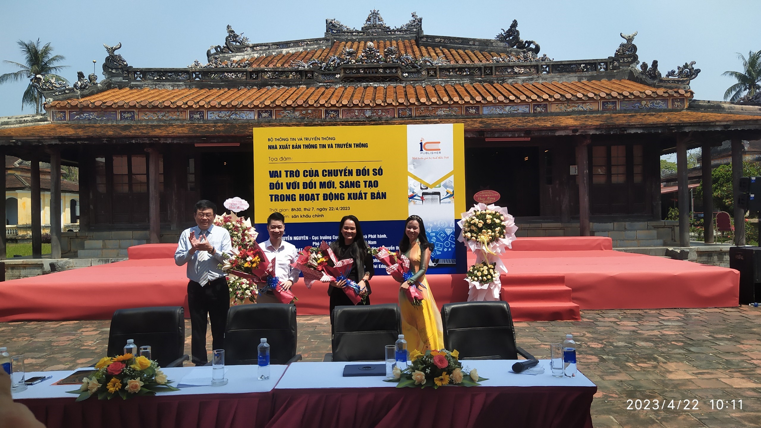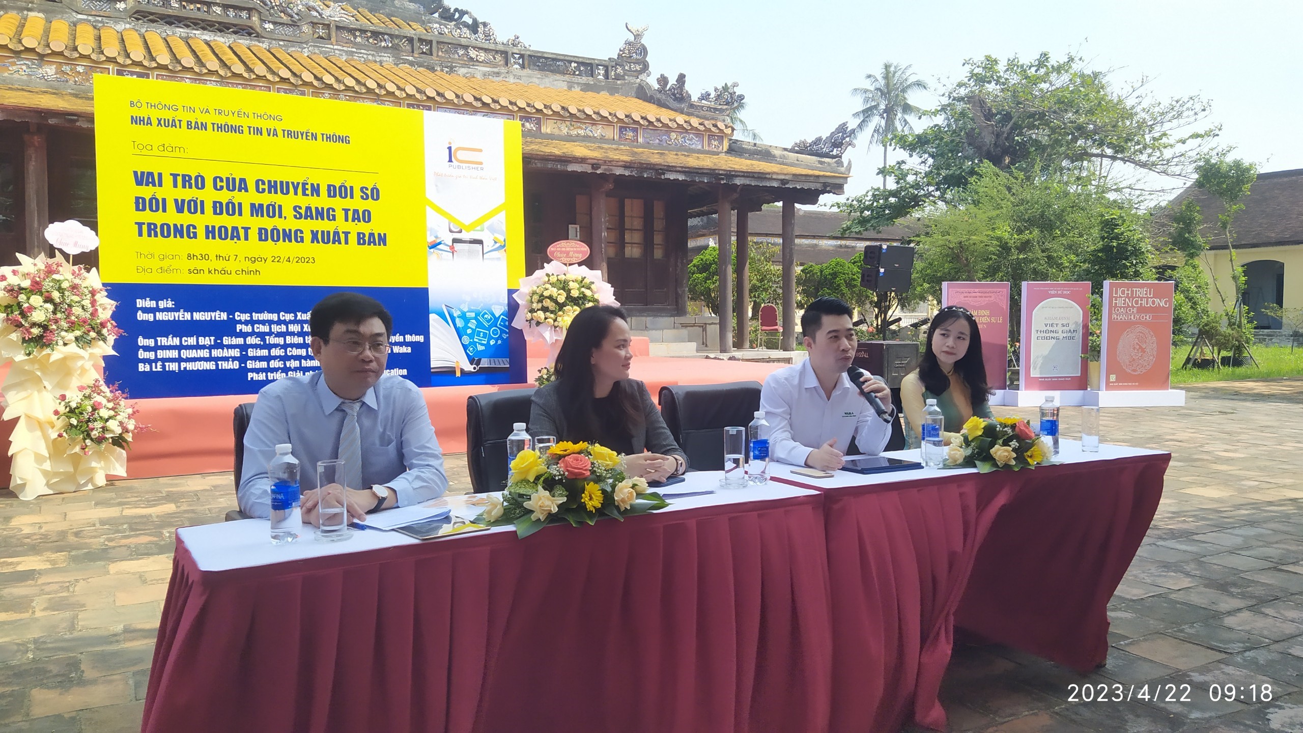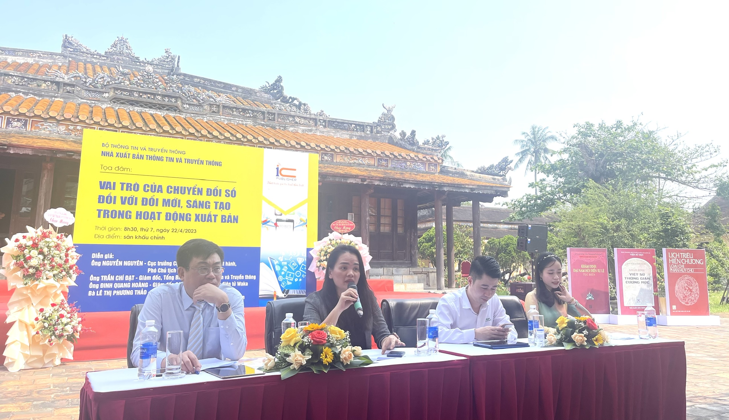 Sáng ngày 22/4/2023, trong khuô khổ Hội sách chào mừng Ngày Sách và Văn hóa đọc Việt Nam 2023 diễn ra tại tỉnh Thừa Thiên Huế với chủ đề Sách, nhận thức, đổi mới, sáng tạo; Sách cho tôi, sách cho bạn, Nhà xuất bản Thông tin và Truyền thông tổ chức Tọa đàm “Vai trò của chuyển đổi số đối với đổi mới, sáng tạo trong hoạt động xuất bản” với sự tham gia của các diễn giả là các chuyên gia, nhà quản lý. Tới dự tọa đàm có Lãnh đạo các Nhà xuất bản, doanh nghiệp phát hành, một số cơ quan tại tỉnh Thừa Thiên Huế cùng đông đảo sinh viên, học sinh và những người quan tâm đến chuyển đổi số nói riêng và xuất bản nói chung. Diễn giả của buổi tọa đàm có ông Trần Chí Đạt - Giám đốc NXB Thông tin và Truyền thông, ông Đinh Quang Hoàng - Giám đốc Công ty Cổ phần sách điện tử Waka, bà Lê Thị Phương Thảo - Giám đốc vận hành Cty CP Phát triển Giải pháp Giáo dục Vivi Education.
