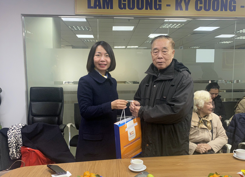 Bà Ngô Thị Mỹ Hạnh - Phó Giám đốc, Phó Tổng Biên tập NXB Thông tin và Truyền thông tặng quà cho các cán bộ hưu trí của NXB