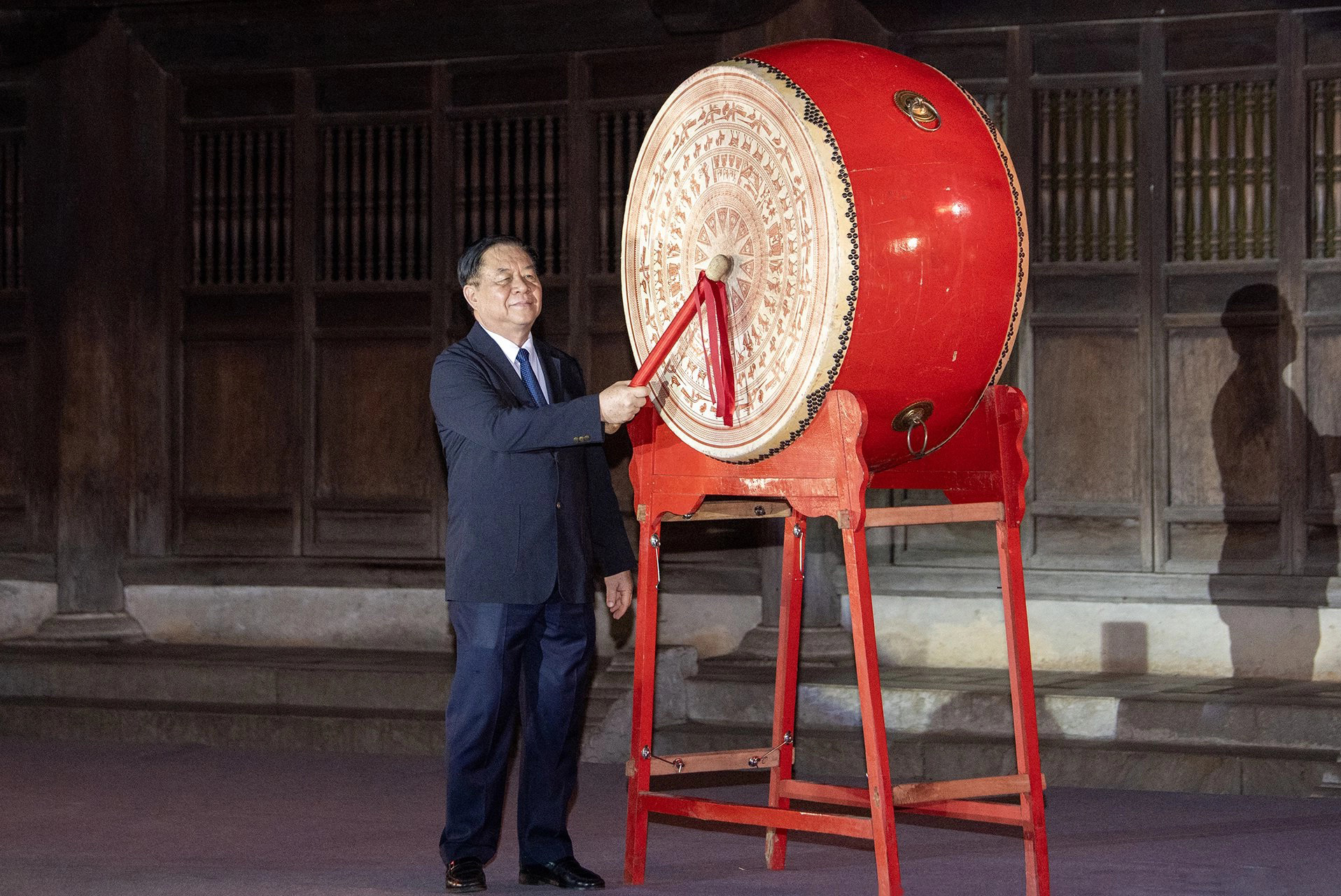 Đồng chí Nguyễn Trọng Nghĩa, Bí thư Trung ương, Trưởng Ban Tuyên giáo Trung ương đánh trống khai mạc Ngày Sách và Văn hóa đọc Việt Nam lần thứ Ba