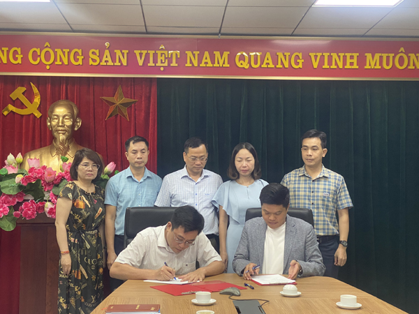 Lãnh đạo hai đơn vị ký kết biên bản ghi nhớ hợp tác với sự chứng kiến của cán bộ chủ chốt của hai bên