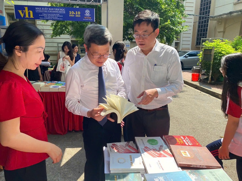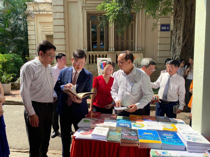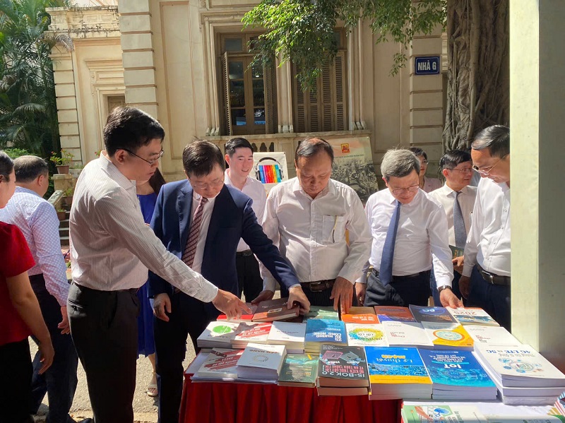 Ông Tống Văn Thanh – Vụ trưởng Vụ Báo chí-Xuất bản (Ban TGTW) và ông Phạm Minh Sơn – Giám đốc Học viện Báo chí và Tuyên truyền thăm gian trưng bày và nghe giới thiệu về một số cuốn sách của Nhà xuất bản Thông tin và Truyền thông