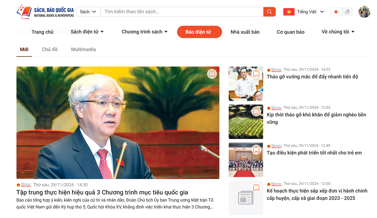 Chiều ngày 29/11/2024 tại Hà Nội, Bộ Thông tin và Truyền thông đã tổ chức ra mắt Nền tảng cung cấp sách, báo điện tử thiết yếu phục vụ mục tiêu, nhiệm vụ giảm nghèo về thông tin (Nền tảng Sách, báo quốc gia), thuộc Chương trình mục tiêu quốc gia Giảm nghèo bền vững giai đoạn 2021 - 2025. Dự lễ ra mắt Nền tảng có ông Bùi Hoàng Phương - Thứ trưởng Bộ Thông tin và Truyền thông, ông Phạm Minh Tuấn - Chủ tịch Hội Xuất bản Việt Nam, ông Nguyễn Nguyên - Cục trưởng Cục Xuất bản, In và Phát hành, ông Lưu Đình Phúc - Cục trưởng Cục Báo chí, ông Trần Chí Đạt - Giám đốc, Tổng Biên tập NXB Thông tin và Truyền thông - đơn vị chủ trì xây dựng Nền tảng, và đại diện một số cơ quan Trung ương; các cơ quan, đơn vị thuộc Bộ thông tin và Truyền thông; các Nhà xuất bản, các cơ quan báo chí, cùng đông đảo phóng viên báo chí đưa tin.
